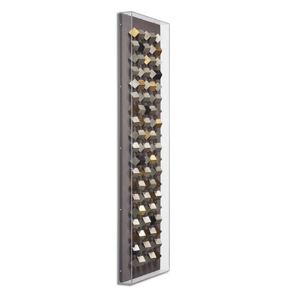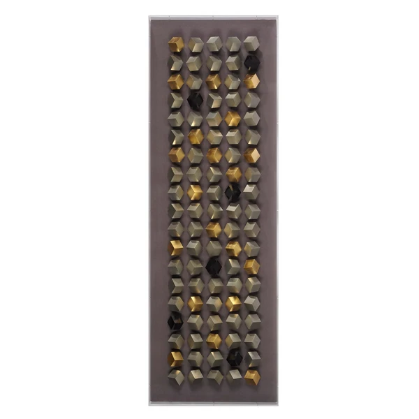 It’s your one way ticket to midnight…call it heavy metal!” Set in a shadowbox frame, this work makes an immediate impact on the wall with its cubic, dimensional design and tri-tone metallic finish.