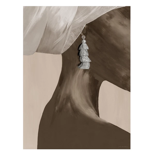 Soft feminine lines create an elegant side profile of a beautiful African American woman wearing a headscarf and four-tier tassel earring.