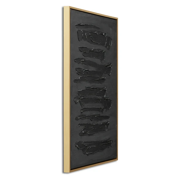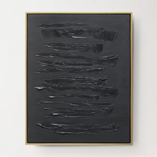 Bold brushstrokes in a moody, dark palette add an incredible element of texture and drama to this abstraction. Painted on canvas, this piece is displayed in a gold floater frame.