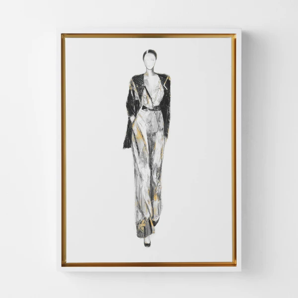 Small-scale in stature, but big on style, the On The Runway Series makes a fashion statement for sure. Each piece is created using giclee on canvas with a hand-applied image brush gel finish. They are framed in white floater frames with gold inner framing. On The Runway X is #1 of 4 in a series.
