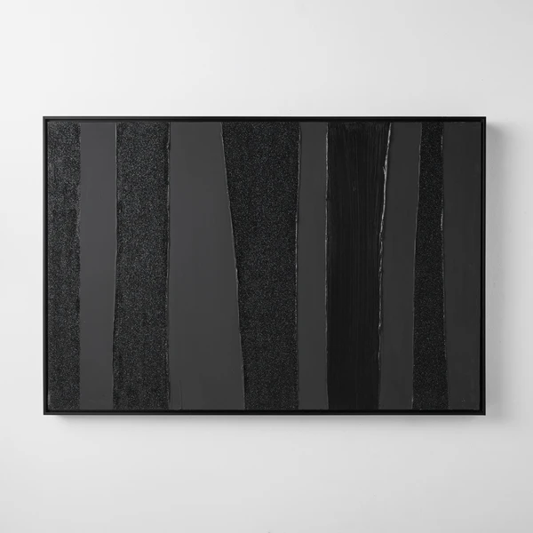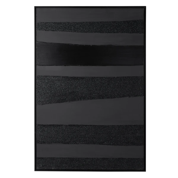 Artist Savannah Yanni makes a monochromatic statement with her Power Power Series. This piece is the black on black choice, which is 100% hand painted on canvas with glitter embellishments. Set in a black floater frame, this is 1 of a series of 2.